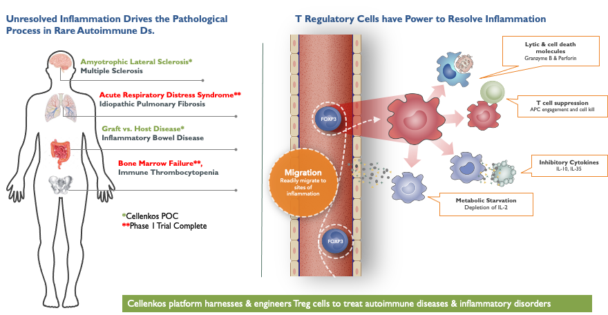 Cellenkos’ Treg cells utilizes the body’s internal GPS to seek out inflammatory hotspots and then quickly leave the circulation to preferentially accumulate in the target inflamed tissue. Upon arrival to the tissue, Cellenkos’ Treg cells leverage their cellular intelligence to dial up or dial down the suppressor function in order to adapt to the local microenvironment. This works to restore the immune equilibrium back to normal. Such dual property as well as self-regulation differentiates Cellenkos Treg cells from all others. Cellenkos’ transformational platform is being developed to generate therapeutics to treat a wide spectrum of diseases driven by inflammatory processes.